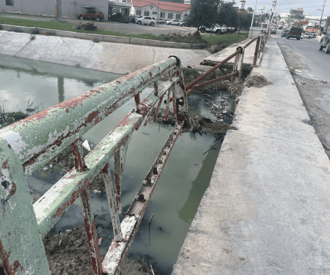 Barandal dañado representa riesgo para peatones en zona de alto tránsito en Reynosa.