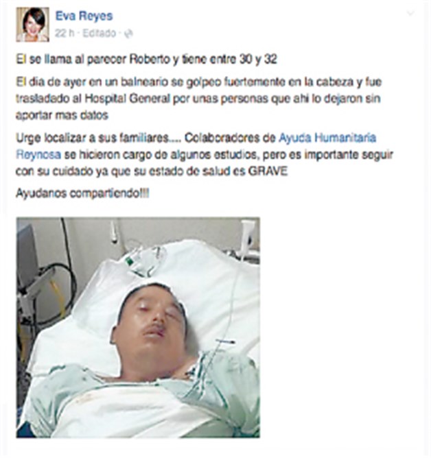 El paciente está muy grave, tiene traumatismo craneoencefálico severo, el lunes fue intervenido quirúrgicamente y con ayuda de la agrupación Ayuda Humanitaria por Reynosa, se pagó el tac que era urgente.