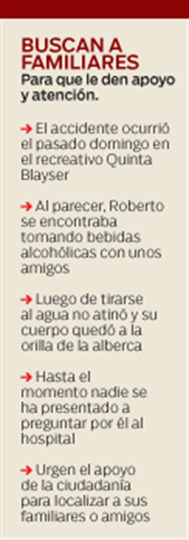 Autoridades del Hospital General buscan a familiares o amigos de un hombre que se aventó de un trampolín en el centro recreativo Quinta Blayser y que cayó desde una altura de cinco metros, en la orilla de la alberca.