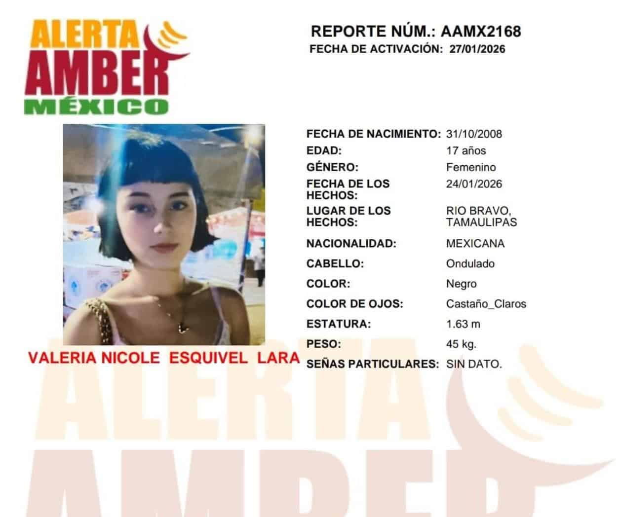 En las carreteras entre las ciudades de Río Bravo y Reynosa se observaron despliegues policiacos por las autoridades estatales y agentes investigadores de la unidad de personas no localizadas, derivado de una alerta Amber que se activó a nivel nacional tras la no localización de una adolescente de 17 años identificada como Valeria Nicole Esquivel Lara.